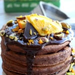 Fluffy chocolate protein pancakes with a hint of fresh orange and rich almond extract, covered in a decadent chocolate maple glaze. A decadently delicious breakfast that is low in sugar, rich in protein and gluten-free.